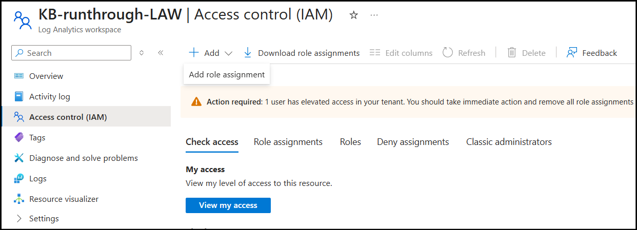 Navigate to your Log Analytics Workspace and go to the Access control (IAM) section.